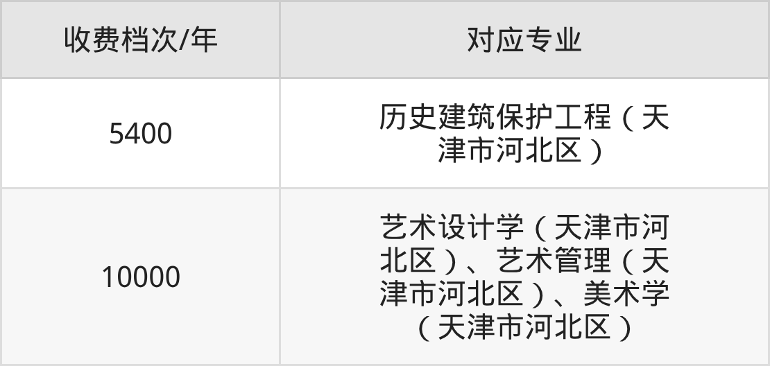 天津美术学院学费收费标准第一档:5400元/年,该学费标准对应专业为历史建筑保护工程(天津市河北区),学制为4年。