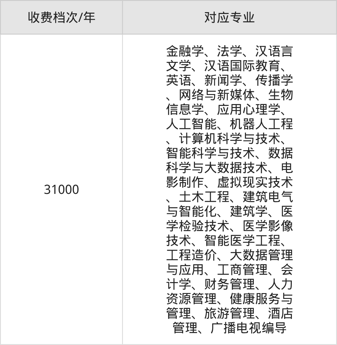 沈阳城市学院学费标准只有1档,最低收费为31000元/年。学费标准主要受专业类型和学制影响,以下详细列举: