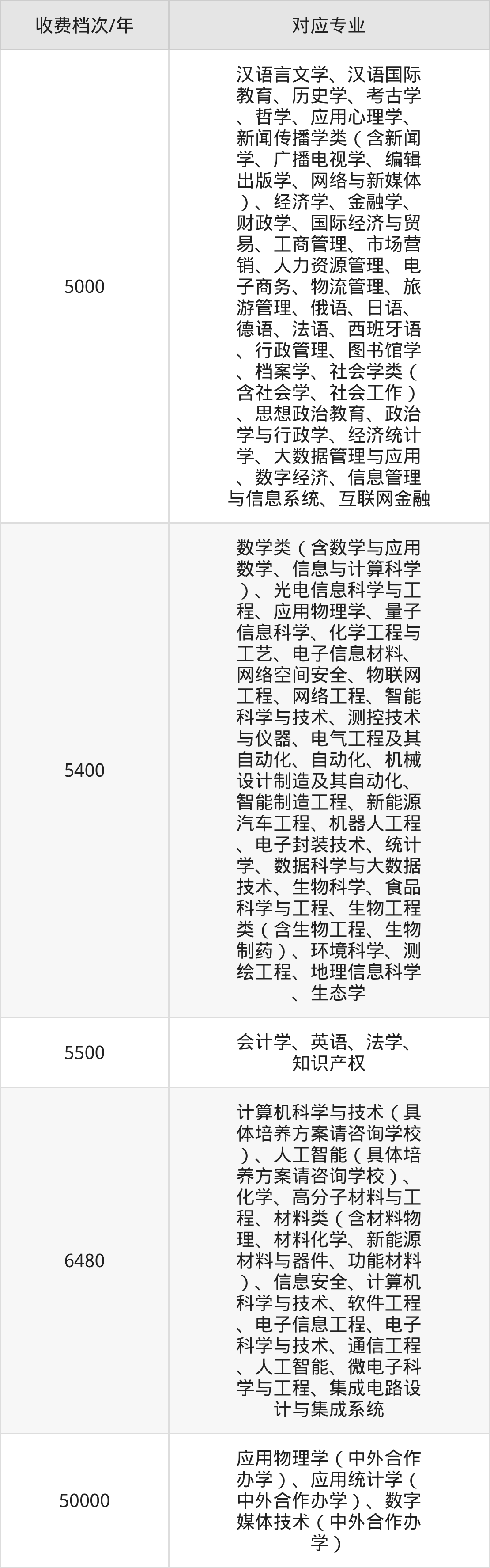 安徽大学学费标准分为5档,最高收费为50000元/年、最低收费为5000元/年。学费标准主要受专业类型和学制影响,以下详细列举: