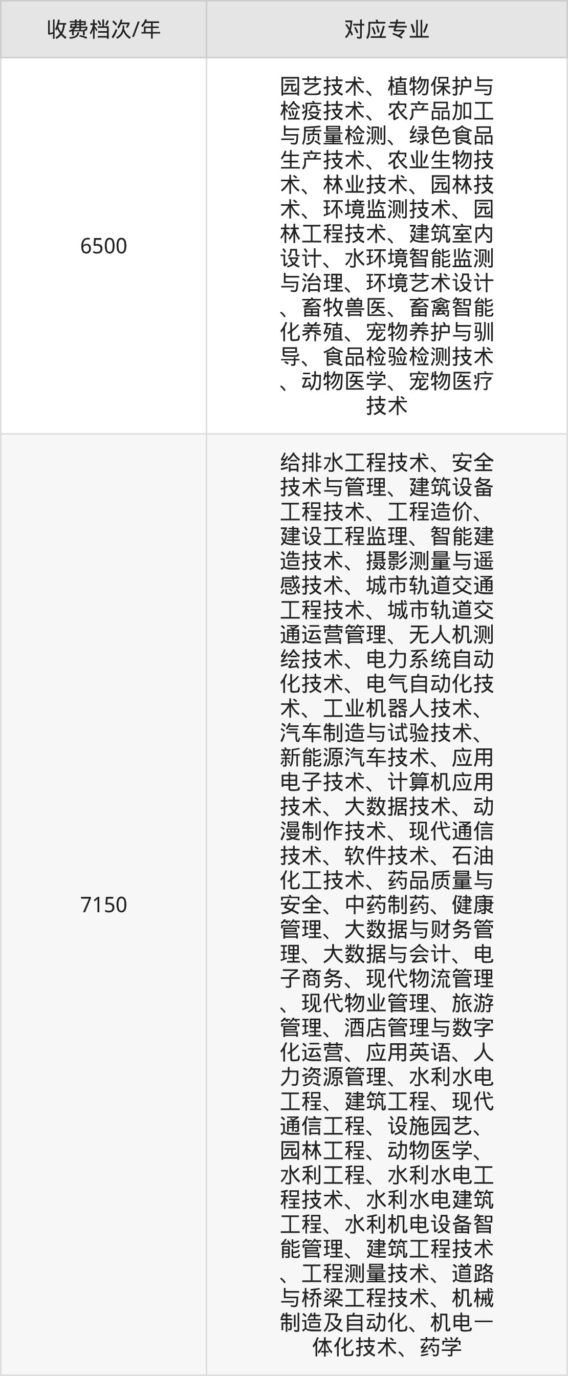 陕西农林职业技术大学学费标准分为2档,最高收费为7150元/年、最低收费为6500元/年。学费标准主要受专业类型和学制影响,以下详细列举: