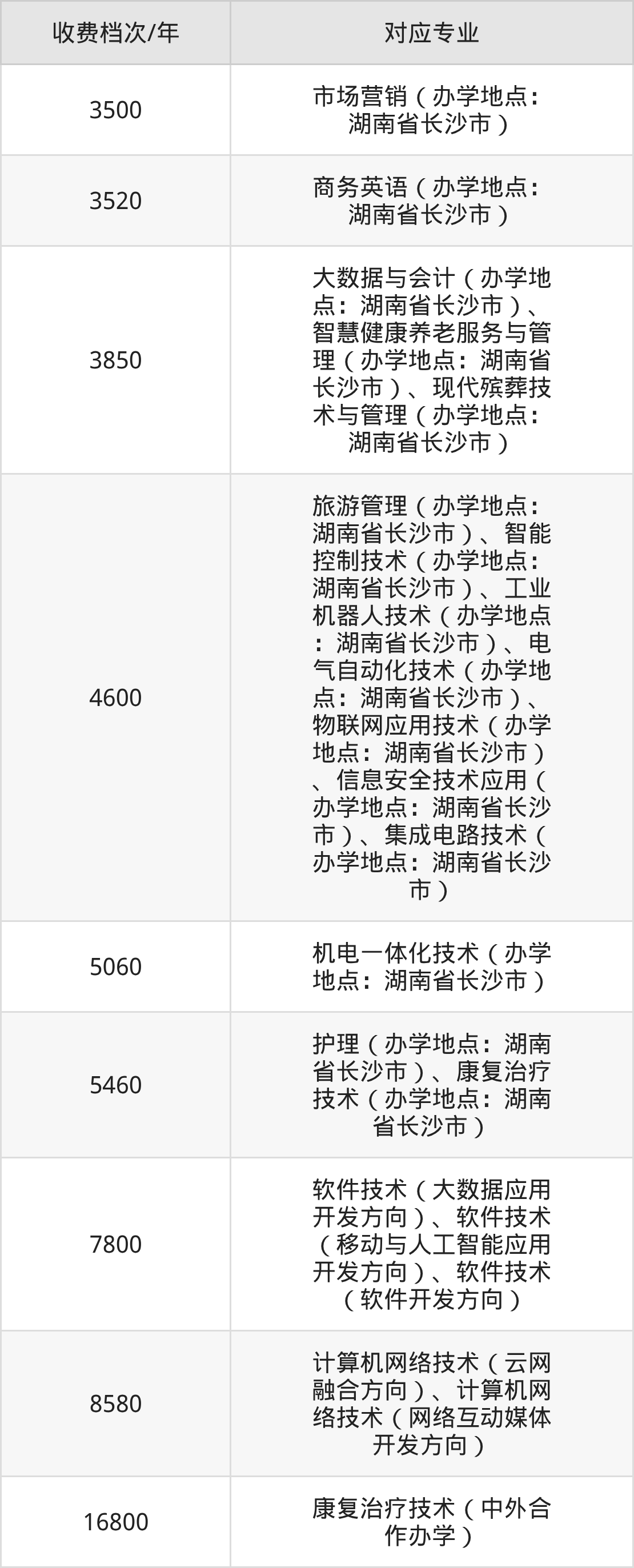 长沙民政职业技术学院学费标准分为9档,最高收费为16800元/年、最低收费为3500元/年。学费标准主要受专业类型和学制影响,以下详细列举: