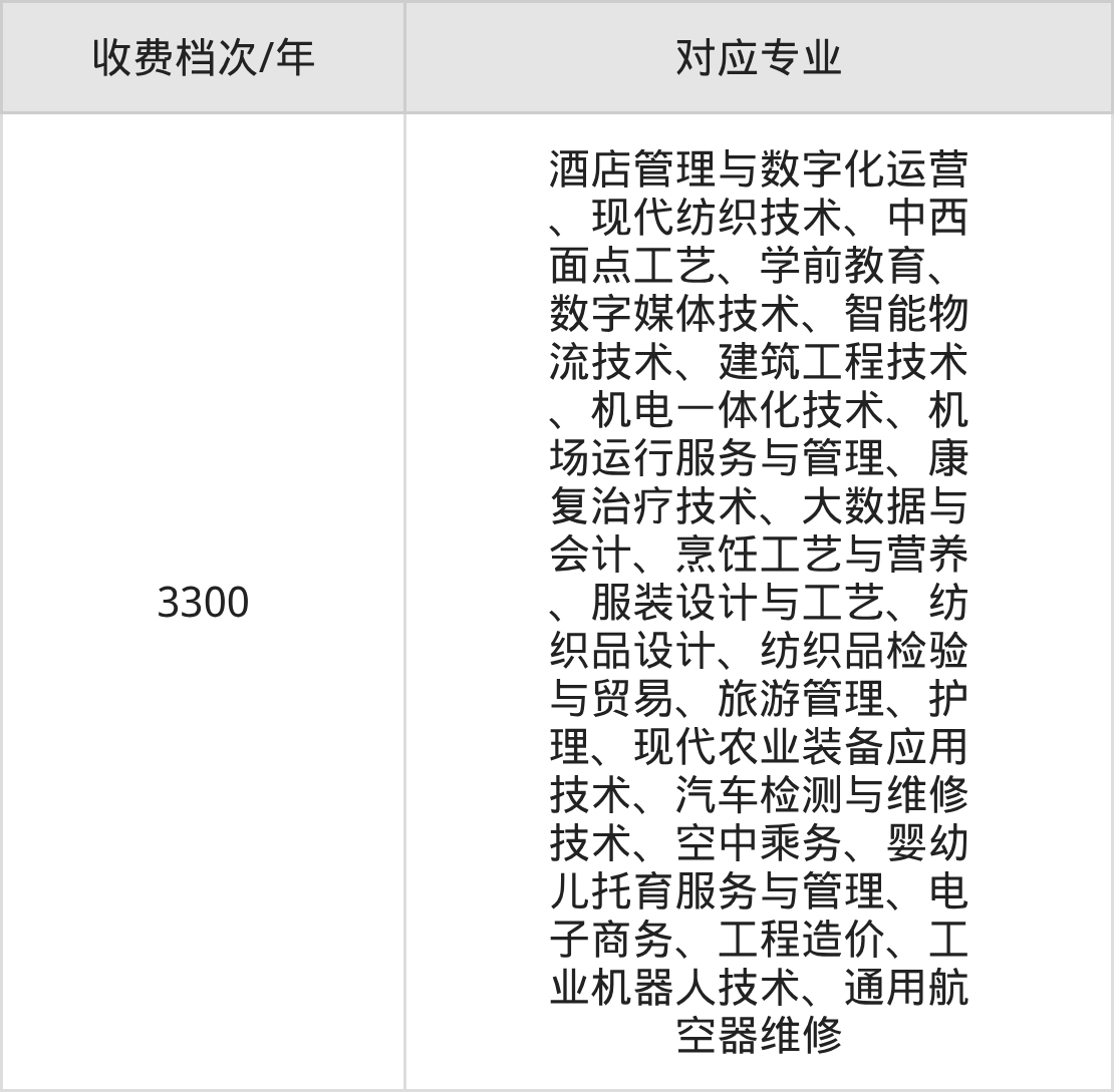 塔里木职业技术学院学费标准只有1档,最低收费为3300元/年。学费标准主要受专业类型和学制影响,以下详细列举: