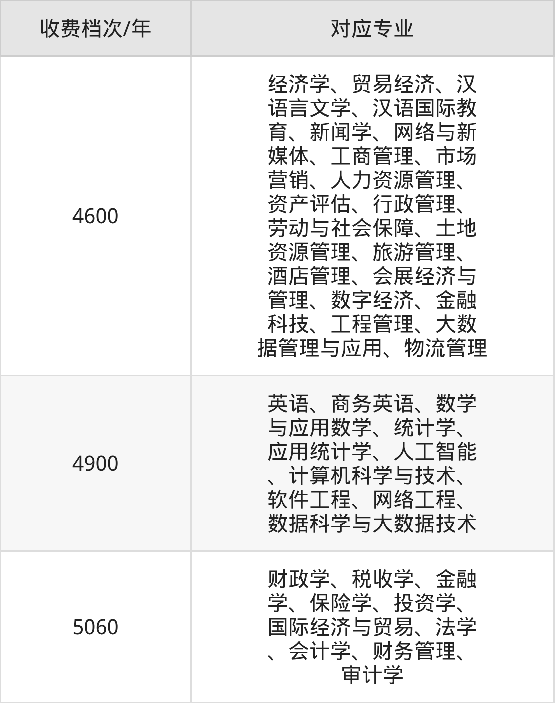 河北经贸大学学费标准分为3档,最高收费为5060元/年、最低收费为4600元/年。学费标准主要受专业类型和学制影响,以下详细列举: