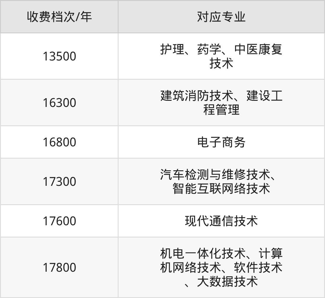 广西科技职业学院学费收费标准第六档:17800元/年,该学费标准对应专业为机电一体化技术、计算机网络技术、软件技术、大数据技术,学制为3年。