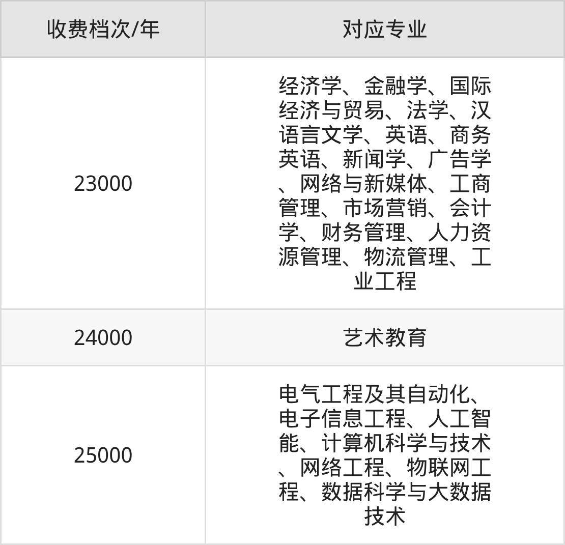 仰恩大学学费标准分为3档,最高收费为25000元/年、最低收费为23000元/年。学费标准主要受专业类型和学制影响,以下详细列举: