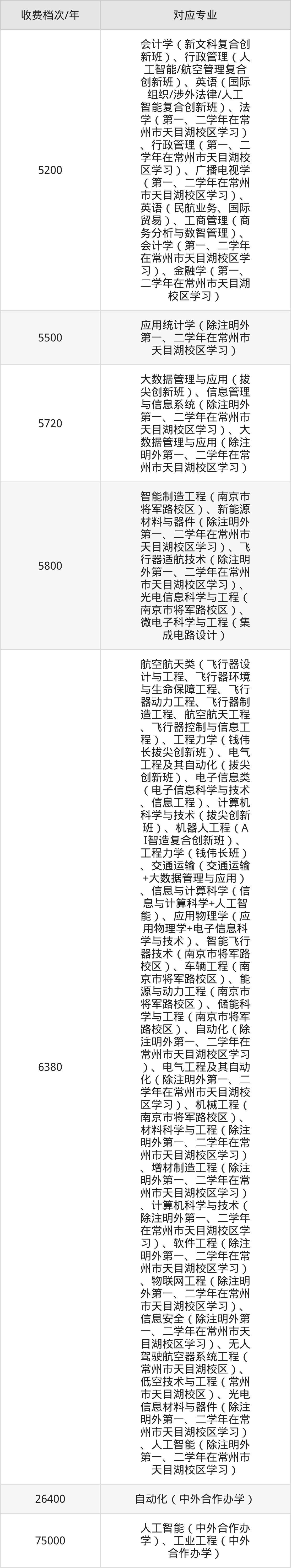 南京航空航天大学学费一年在5200元-75000元之间,各专业收费档次有7个,分别为5200元/年、5500元/年、5720元/年、5800元/年、6380元/年、26400元/年、75000元/年。低学费专业包含会计学、行政管理、英语、法学、广播电视学等,高学费专业包含人工智能、工业工程。