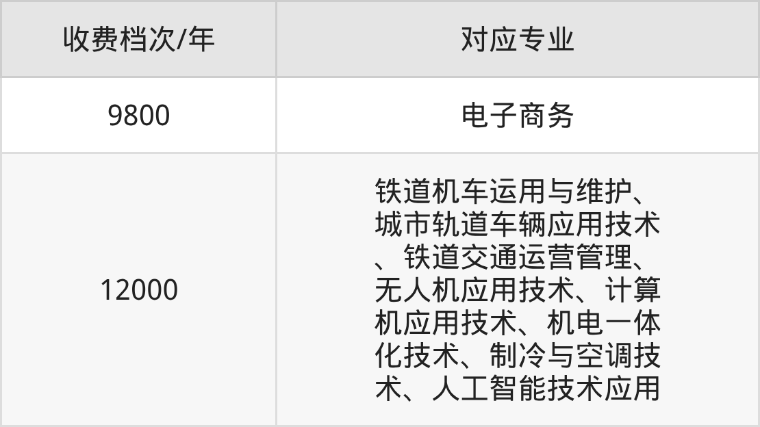 武汉科技职业学院学费收费标准第二档:12000元/年,该学费标准对应专业为铁道机车运用与维护、城市轨道车辆应用技术、铁道交通运营管理、无人机应用技术、计算机应用技术、机电一体化技术、制冷与空调技术、人工智能技术应用,学制为3年。