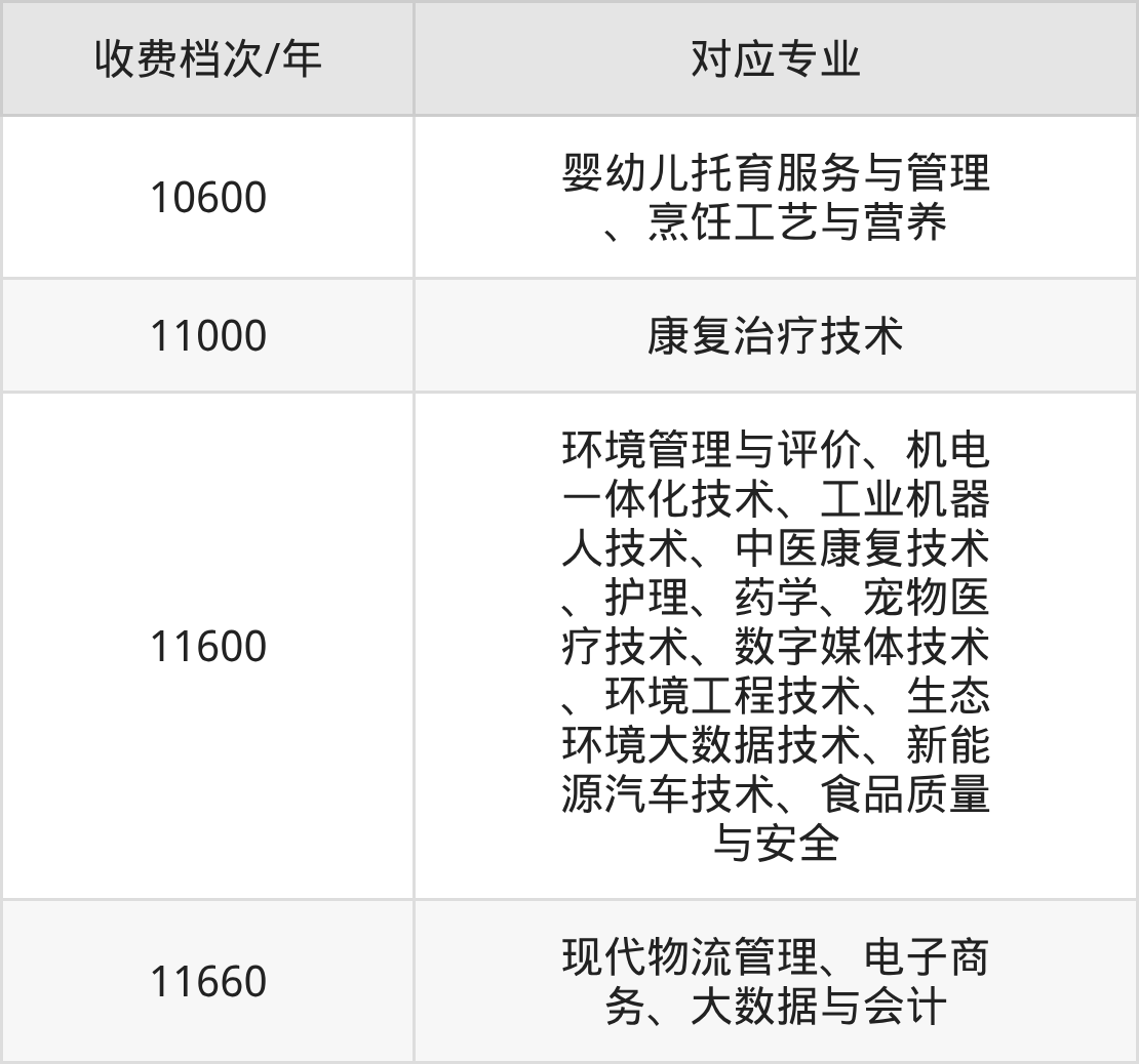 资阳环境科技职业学院学费标准分为4档,最高收费为11660元/年、最低收费为10600元/年。学费标准主要受专业类型和学制影响,以下详细列举: