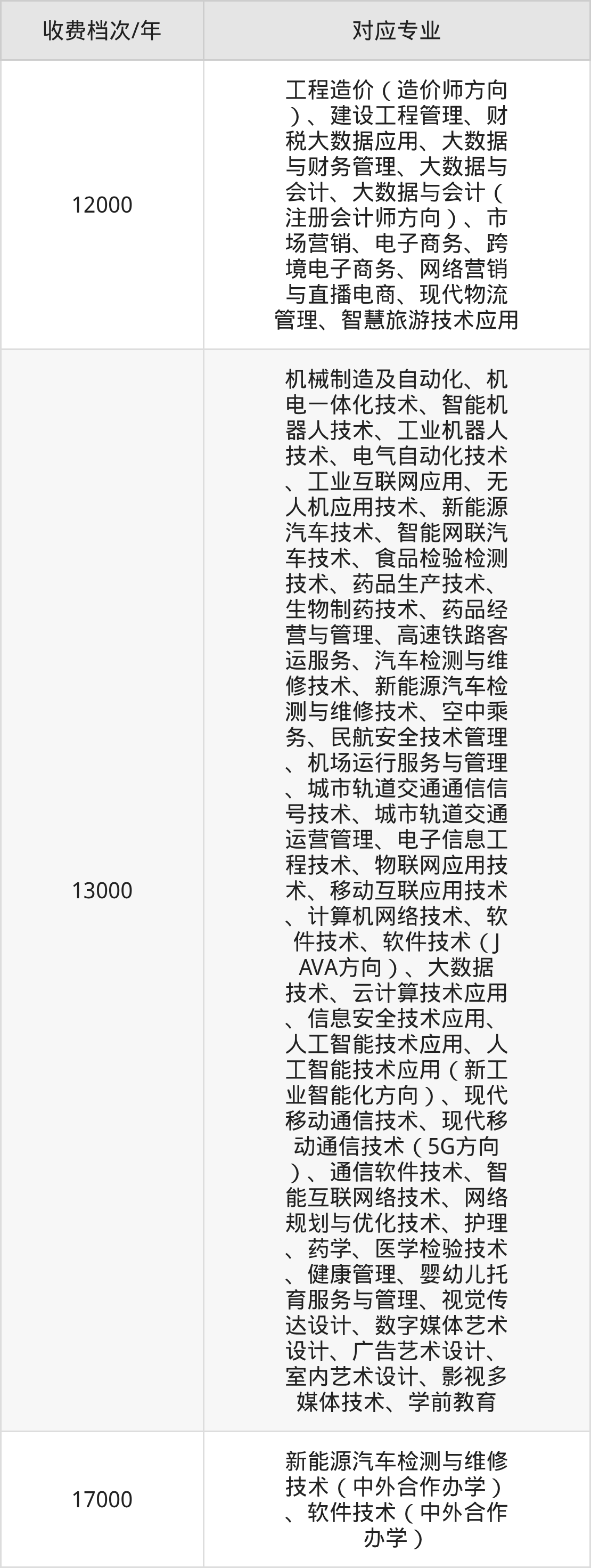 石家庄科技信息职业学院学费收费标准第三档:17000元/年,该学费标准对应专业为新能源汽车检测与维修技术(中外合作办学)、软件技术(中外合作办学),学制为3年。