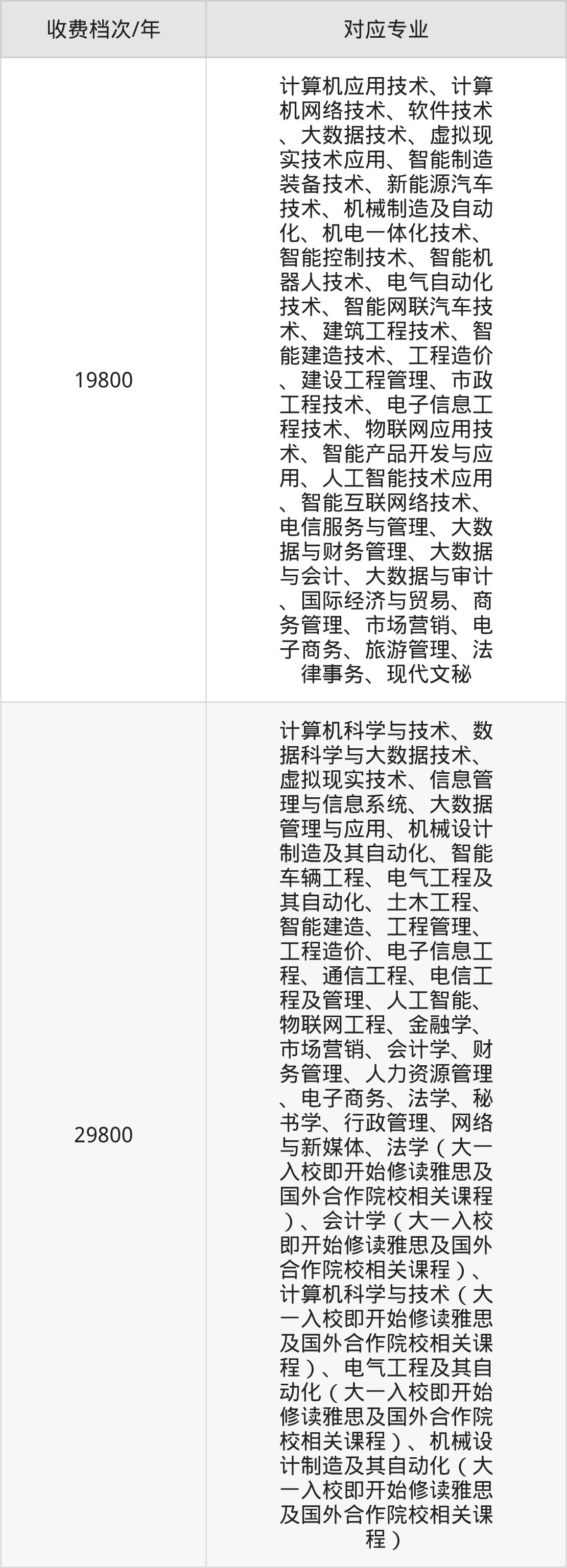 泰山科技学院学费标准分为2档,最高收费为29800元/年、最低收费为19800元/年。学费标准主要受专业类型和学制影响,以下详细列举: