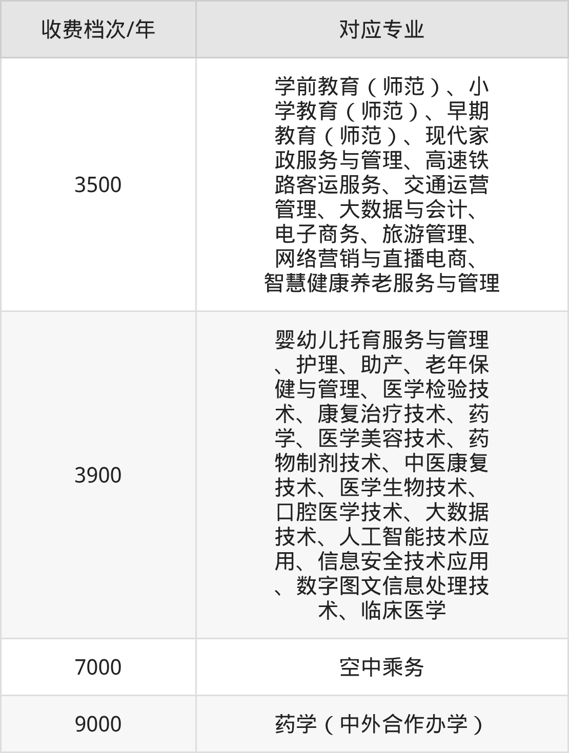 滁州城市职业学院学费收费标准第三档:7000元/年,该学费标准对应专业为空中乘务,学制为3年。