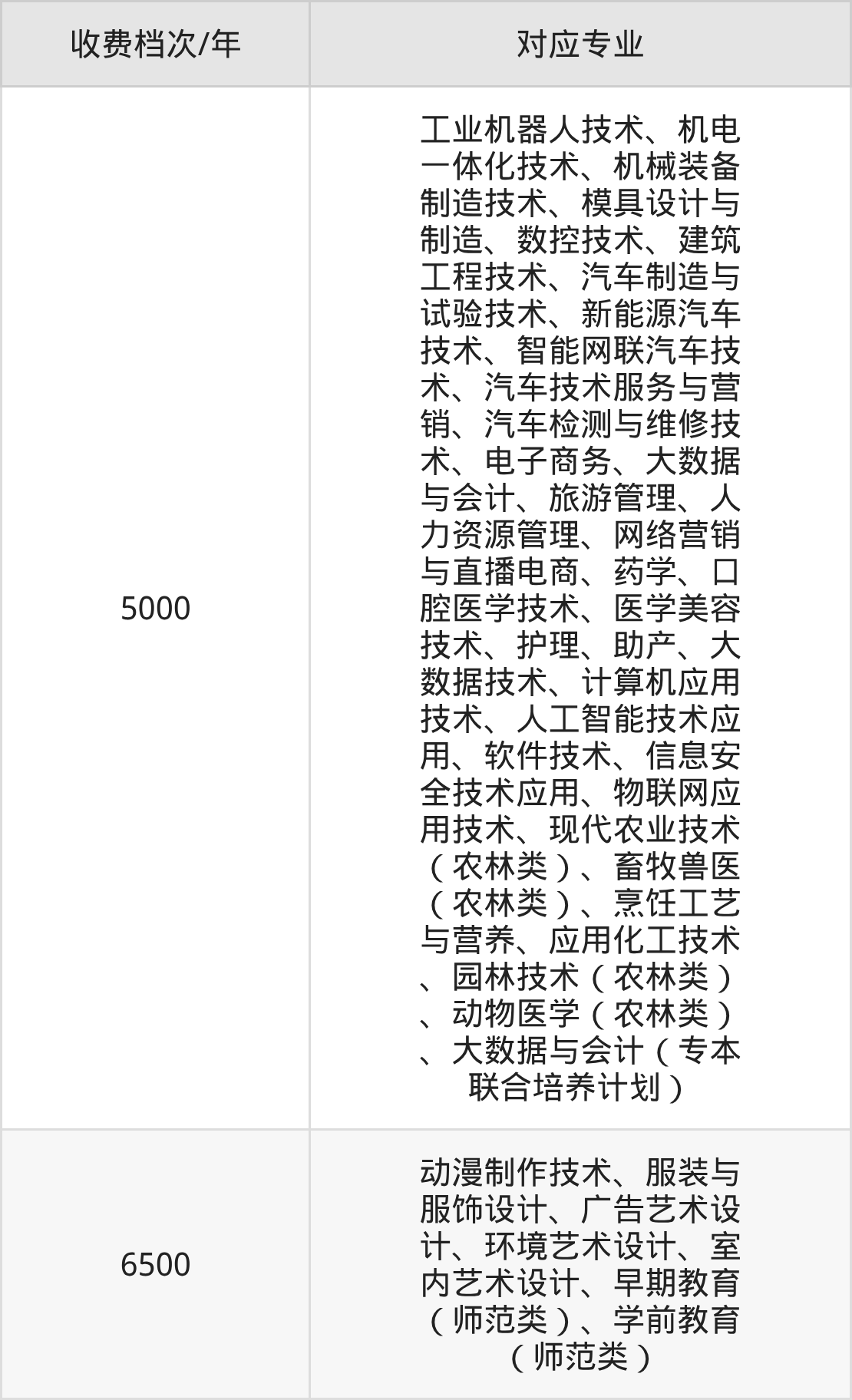 荆州职业技术学院学费标准分为2档,最高收费为6500元/年、最低收费为5000元/年。学费标准主要受专业类型和学制影响,以下详细列举: