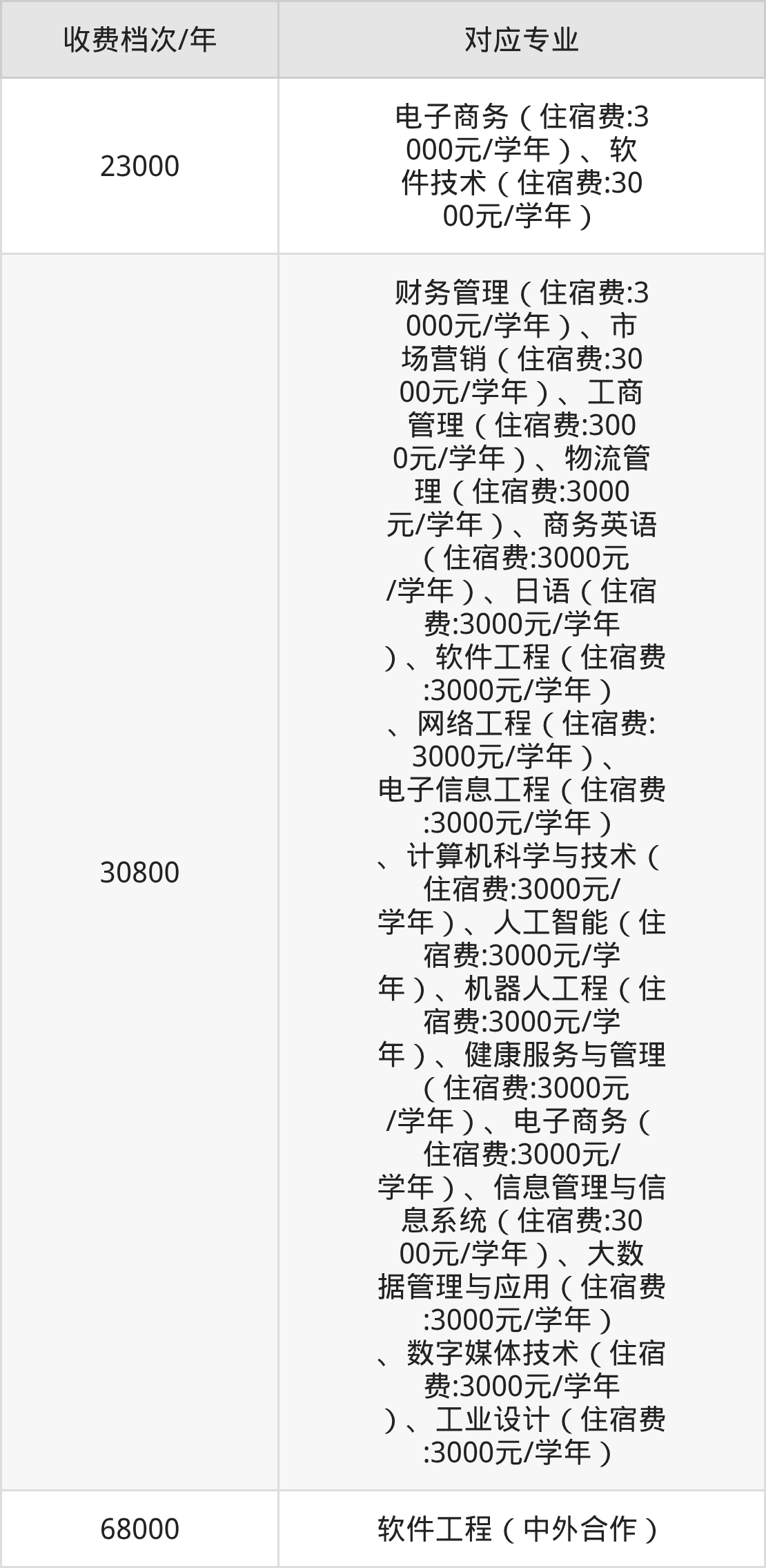 广东东软学院学费收费标准第一档:23000元/年,该学费标准对应专业为电子商务(住宿费:3000元/学年)、软件技术(住宿费:3000元/学年),学制为3年。