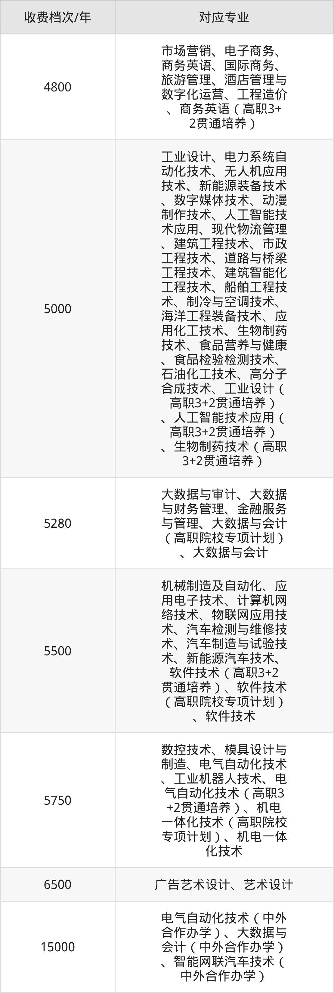 烟台职业学院学费标准分为7档,最高收费为15000元/年、最低收费为4800元/年。学费标准主要受专业类型和学制影响,以下详细列举: