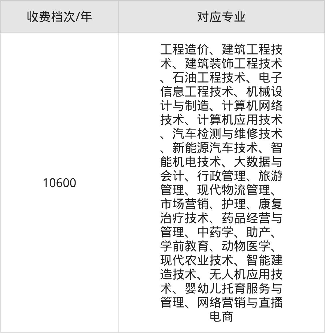 四川三河职业学院学费标准只有1档,最低收费为10600元/年。学费标准主要受专业类型和学制影响,以下详细列举: