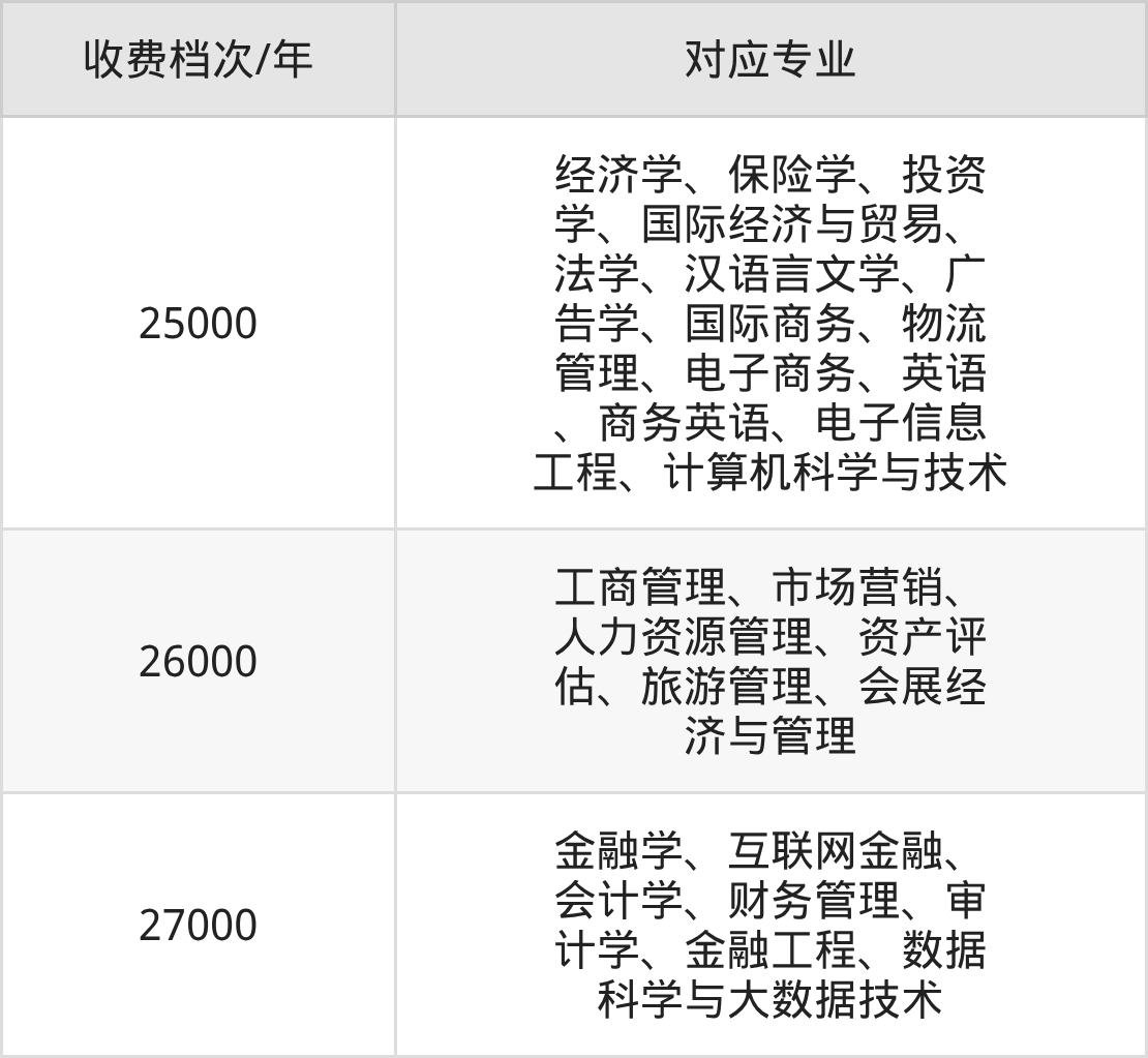 黑龙江财经学院学费标准分为3档,最高收费为27000元/年、最低收费为25000元/年。学费标准主要受专业类型和学制影响,以下详细列举: