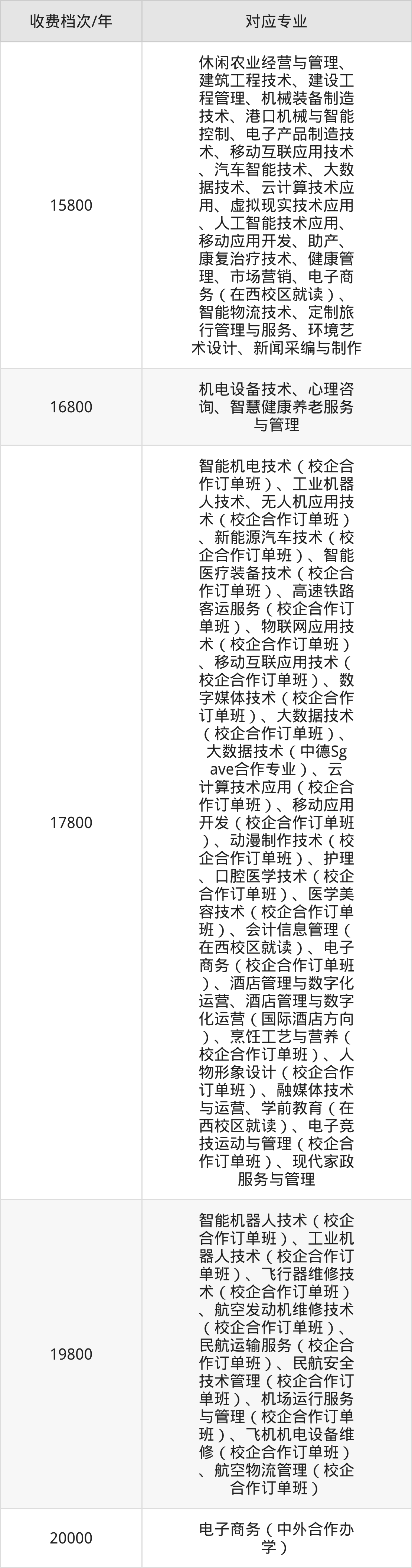 曹妃甸职业技术学院学费标准分为5档,最高收费为20000元/年、最低收费为15800元/年。学费标准主要受专业类型和学制影响,以下详细列举: