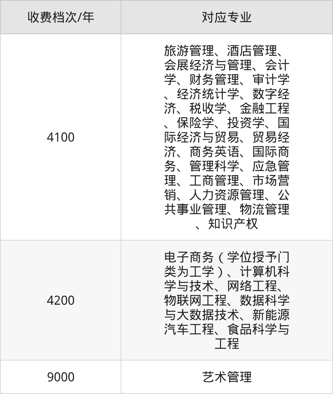贵州商学院学费收费标准第一档:4100元/年,该学费标准对应专业为旅游管理、酒店管理、会展经济与管理、会计学、财务管理、审计学、经济统计学、数字经济、税收学、金融工程等,学制为4年。