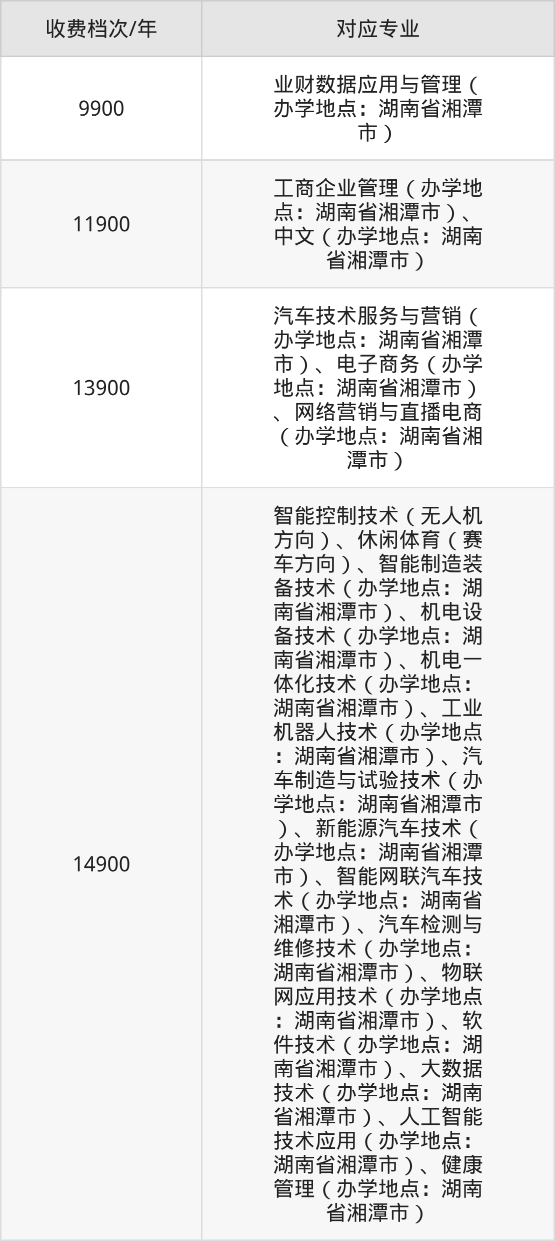 湖南吉利汽车职业技术学院学费标准分为4档,最高收费为14900元/年、最低收费为9900元/年。学费标准主要受专业类型和学制影响,以下详细列举: