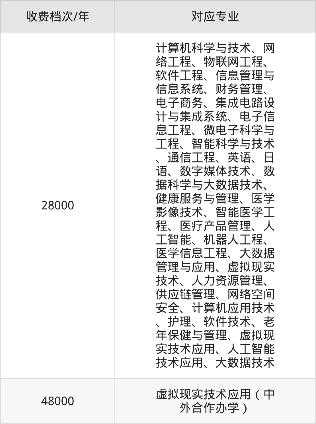 大连东软信息学院学费标准分为2档,最高收费为48000元/年、最低收费为28000元/年。学费标准主要受专业类型和学制影响,以下详细列举: