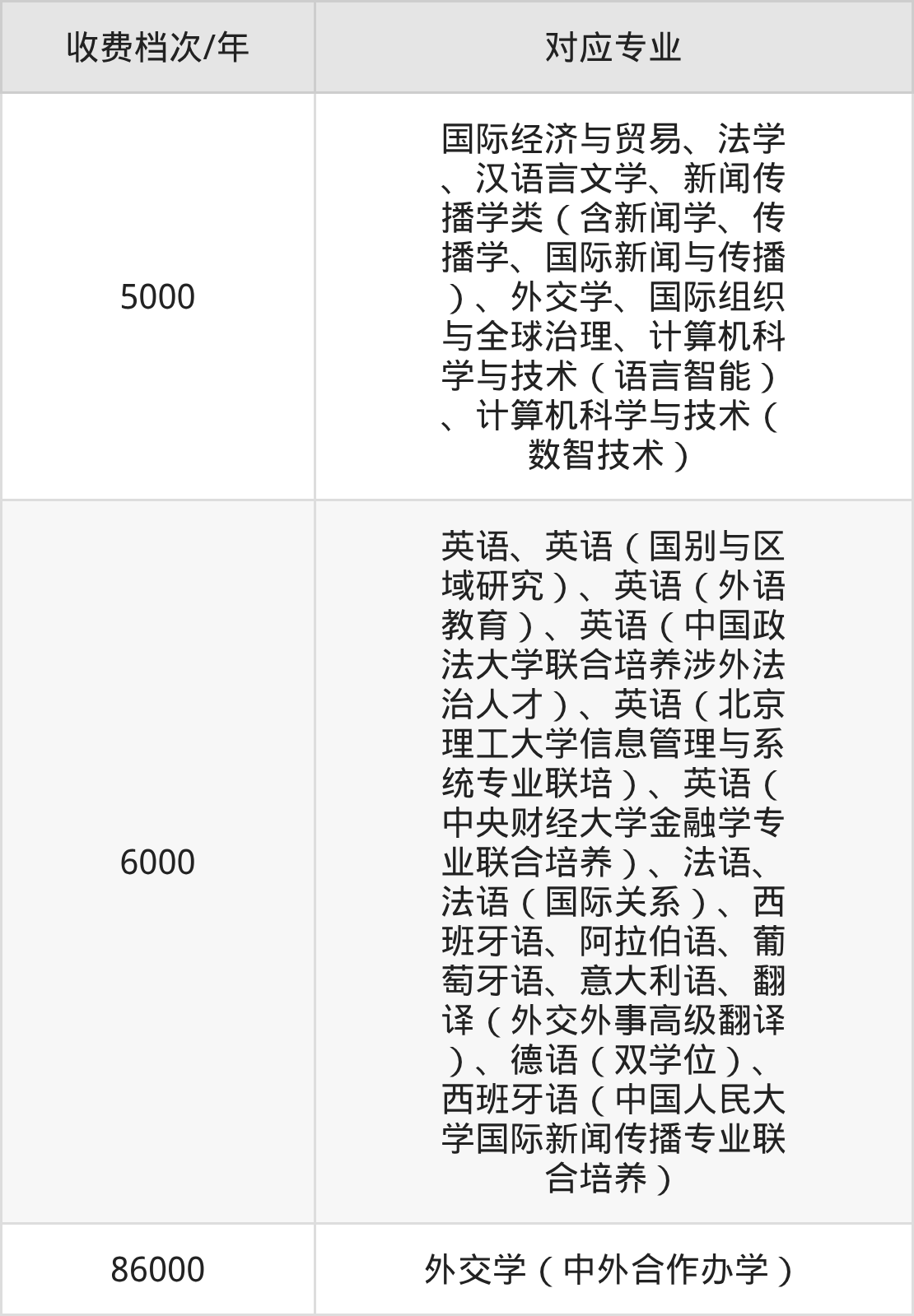 北京外国语大学学费一年在5000元-86000元之间,各专业收费档次有3个,分别为5000元/年、6000元/年、86000元/年。低学费专业包含国际经济与贸易、法学、汉语言文学、新闻传播学类、外交学等,高学费专业包含外交学。