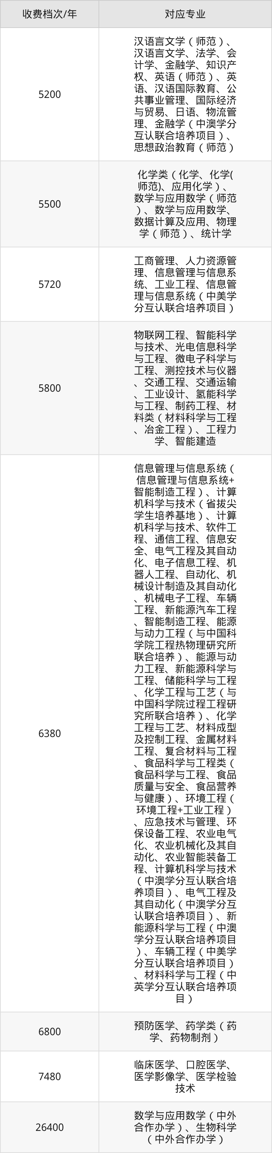江苏大学学费标准分为8档,最高收费为26400元/年、最低收费为5200元/年。学费标准主要受专业类型和学制影响,以下详细列举: