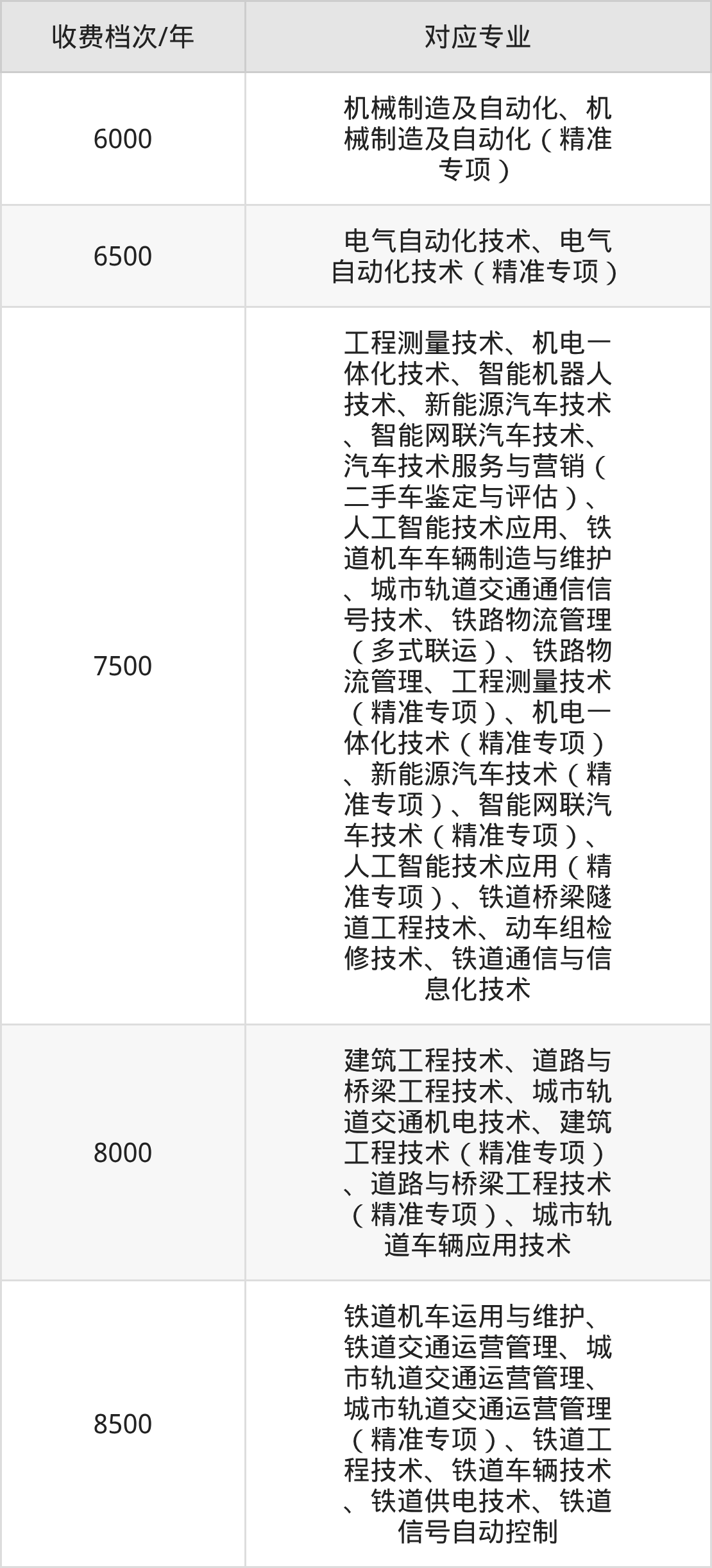 柳州铁道职业技术学院学费标准分为5档,最高收费为8500元/年、最低收费为6000元/年。学费标准主要受专业类型和学制影响,以下详细列举: