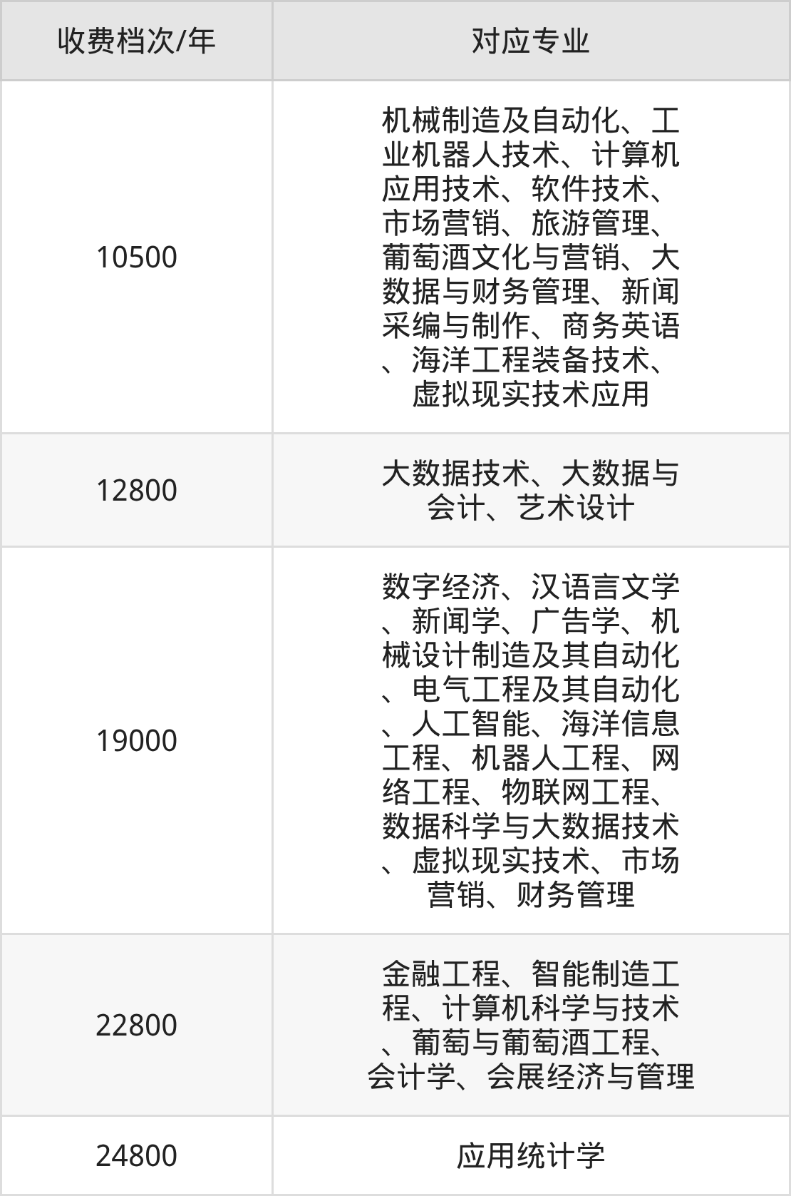 烟台科技学院学费标准分为5档,最高收费为24800元/年、最低收费为10500元/年。学费标准主要受专业类型和学制影响,以下详细列举: