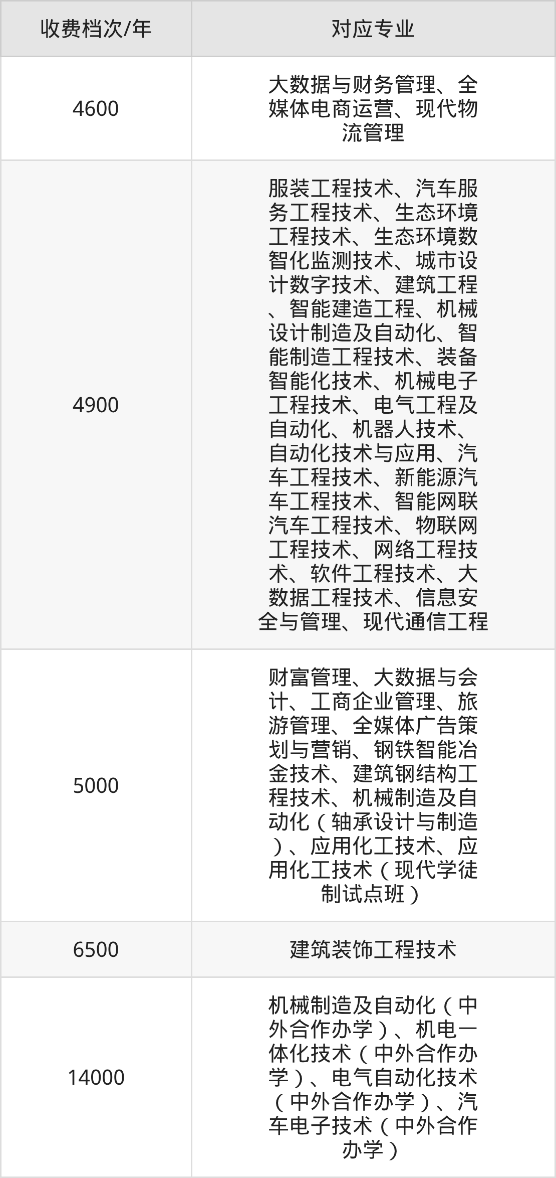 河北科技工程职业技术大学学费标准分为5档,最高收费为14000元/年、最低收费为4600元/年。学费标准主要受专业类型和学制影响,以下详细列举: