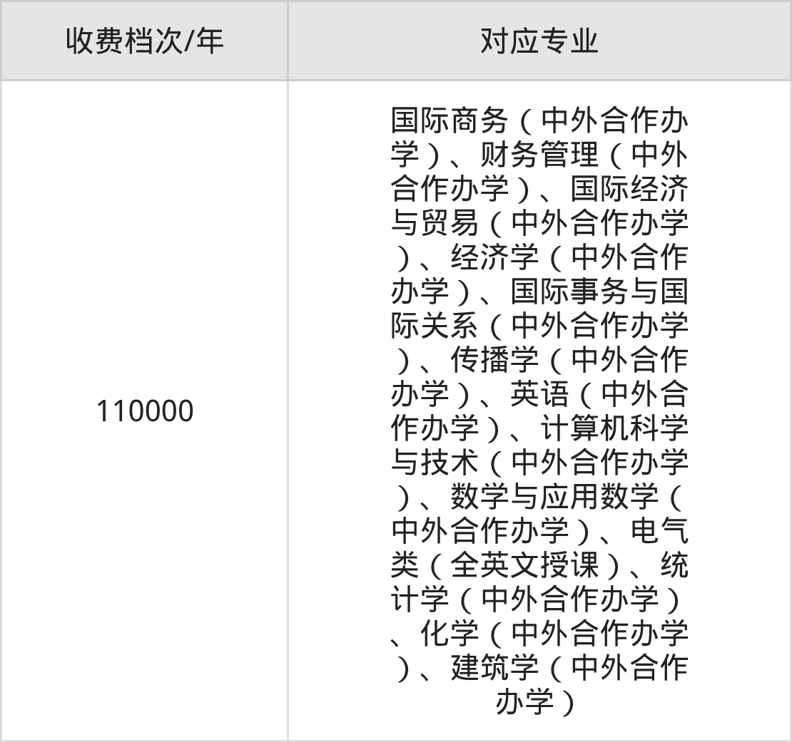 宁波诺丁汉大学学费标准只有1档,最低收费为110000元/年。学费标准主要受专业类型和学制影响,以下详细列举: