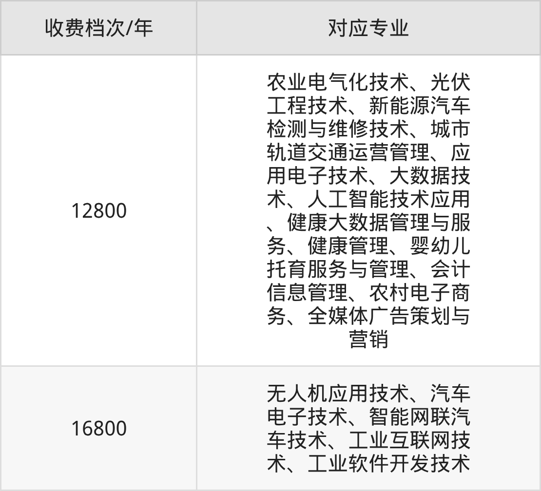 邢台应用技术职业学院学费标准分为2档,最高收费为16800元/年、最低收费为12800元/年。学费标准主要受专业类型和学制影响,以下详细列举: