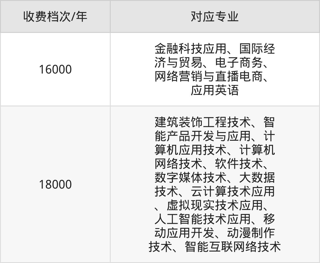 宿迁职业技术学院学费标准分为2档,最高收费为18000元/年、最低收费为16000元/年。学费标准主要受专业类型和学制影响,以下详细列举: