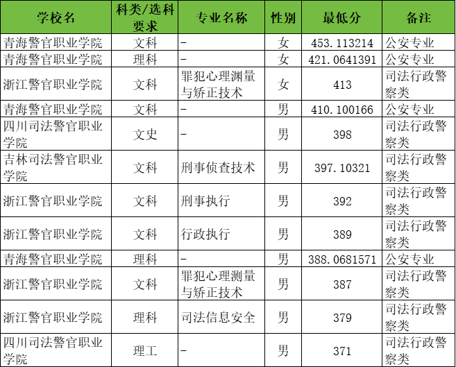2024年在青海招收女生的学校只有2所院校,涉及到1个专业,其中收分最高的是青海警官职业学院,2024年的最低分数线为453.113214048分;收分最低的是浙江警官职业学院罪犯心理渊量与矫正技术,2024年的最低分数线为413分。