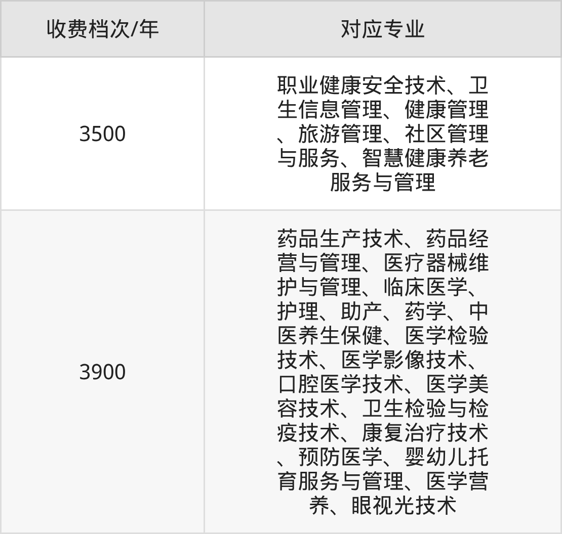 安徽卫生健康职业学院学费标准分为2档,最高收费为3900元/年、最低收费为3500元/年。学费标准主要受专业类型和学制影响,以下详细列举: