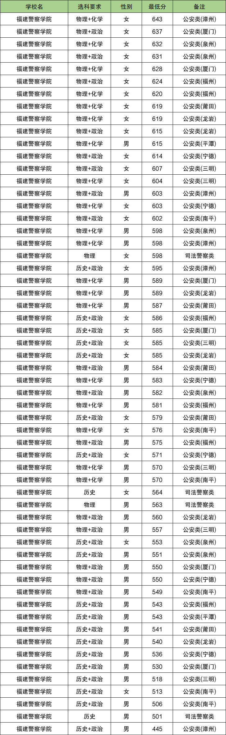 1、福建警察学院:在福建历史类最低分445分、物理类最低549分。