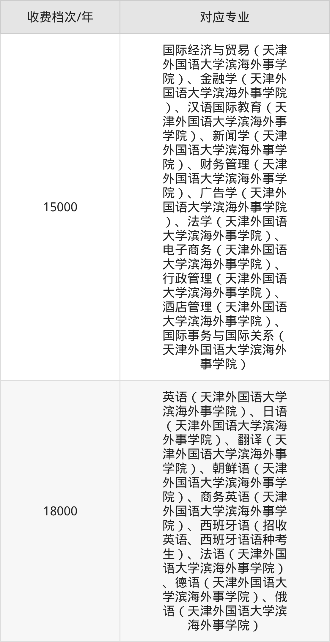 天津外国语大学滨海外事学院学费标准分为2档,最高收费为18000元/年、最低收费为15000元/年。学费标准主要受专业类型和学制影响,以下详细列举: