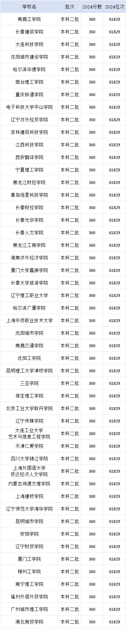 以理科二本线为例,该分数位次排名61565名~61829名对应的学校有:集美大学诚毅学院、沈阳科技学院、重庆外语外事学院、南昌工学院、长春建筑学院、大连科技学院、沈阳城市建设学院等。