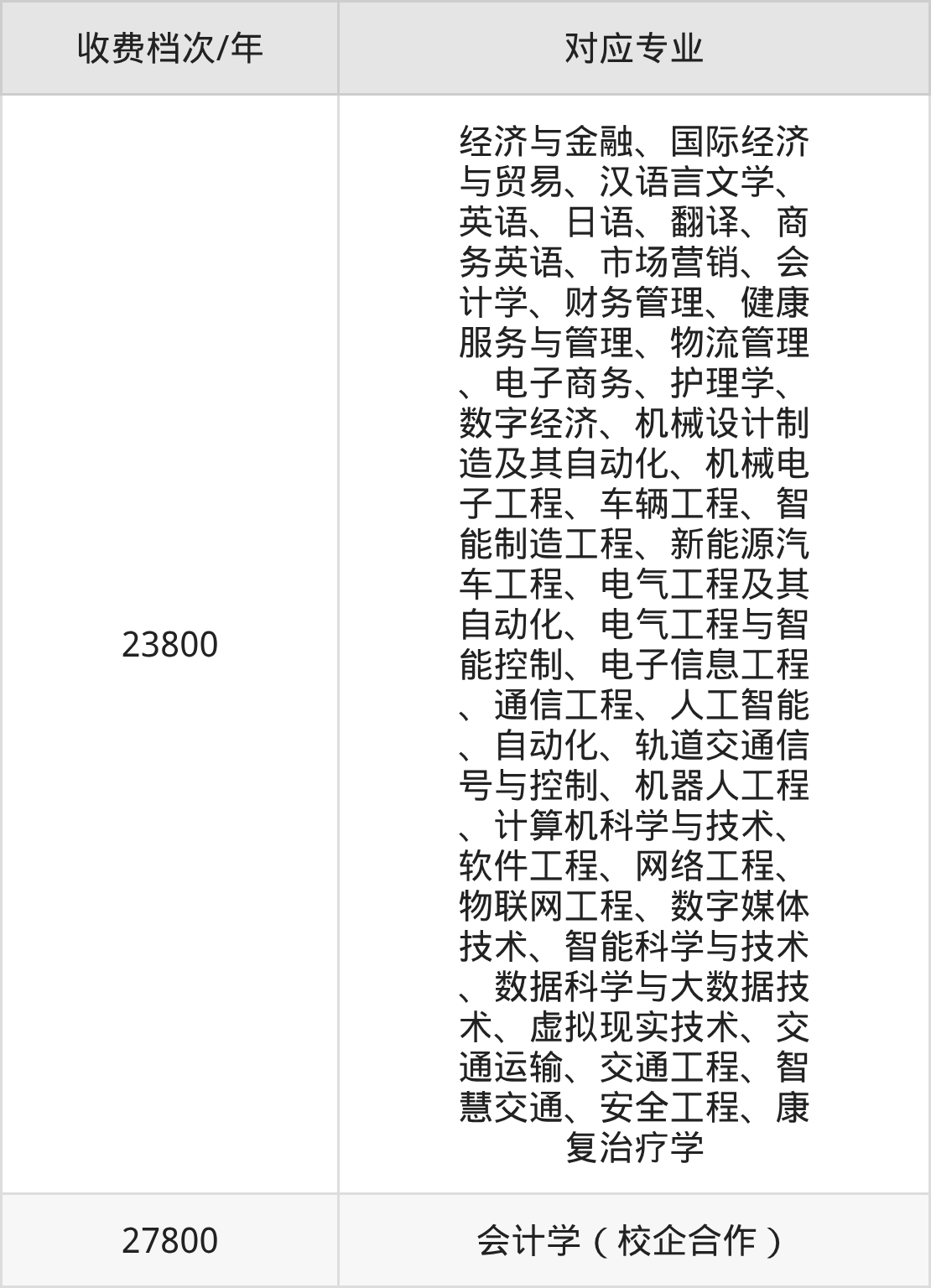 安徽三联学院学费标准分为2档,最高收费为27800元/年、最低收费为23800元/年。学费标准主要受专业类型和学制影响,以下详细列举: