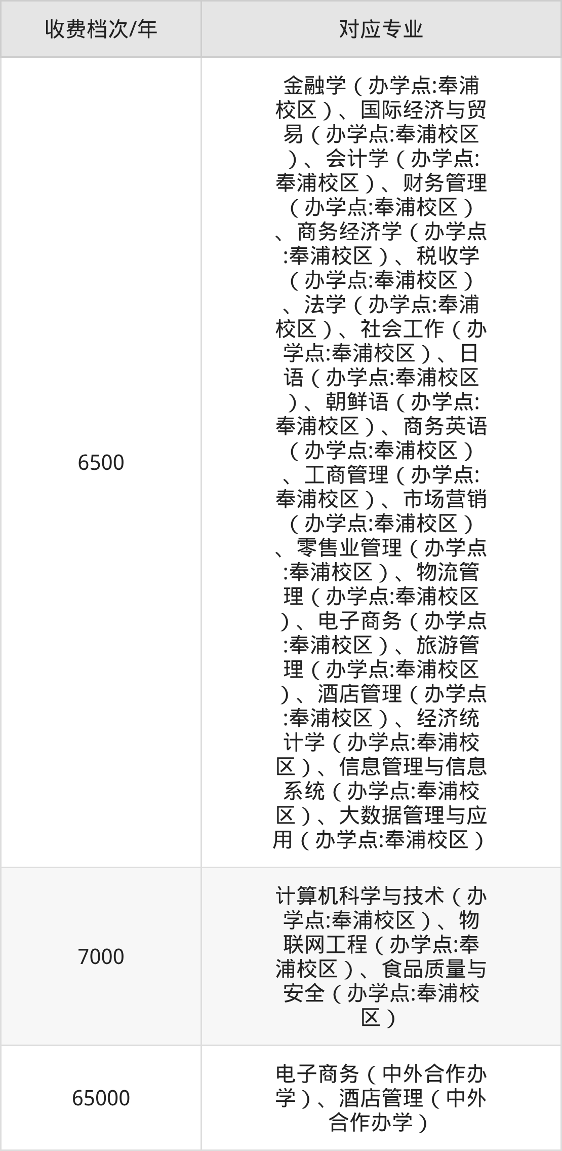 上海商学院学费收费标准第一档:6500元/年,该学费标准对应专业为金融学(办学点:奉浦校区)、国际经济与贸易(办学点:奉浦校区)、会计学(办学点:奉浦校区)、财务管理(办学点:奉浦校区)、商务经济学(办学点:奉浦校区)、税收学(办学点:奉浦校区)、法学(办学点:奉浦校区)、社会工作(办学点:奉浦校区)、日语(办学点:奉浦校区)、朝鲜语(办学点:奉浦校区)等,学制为4年。