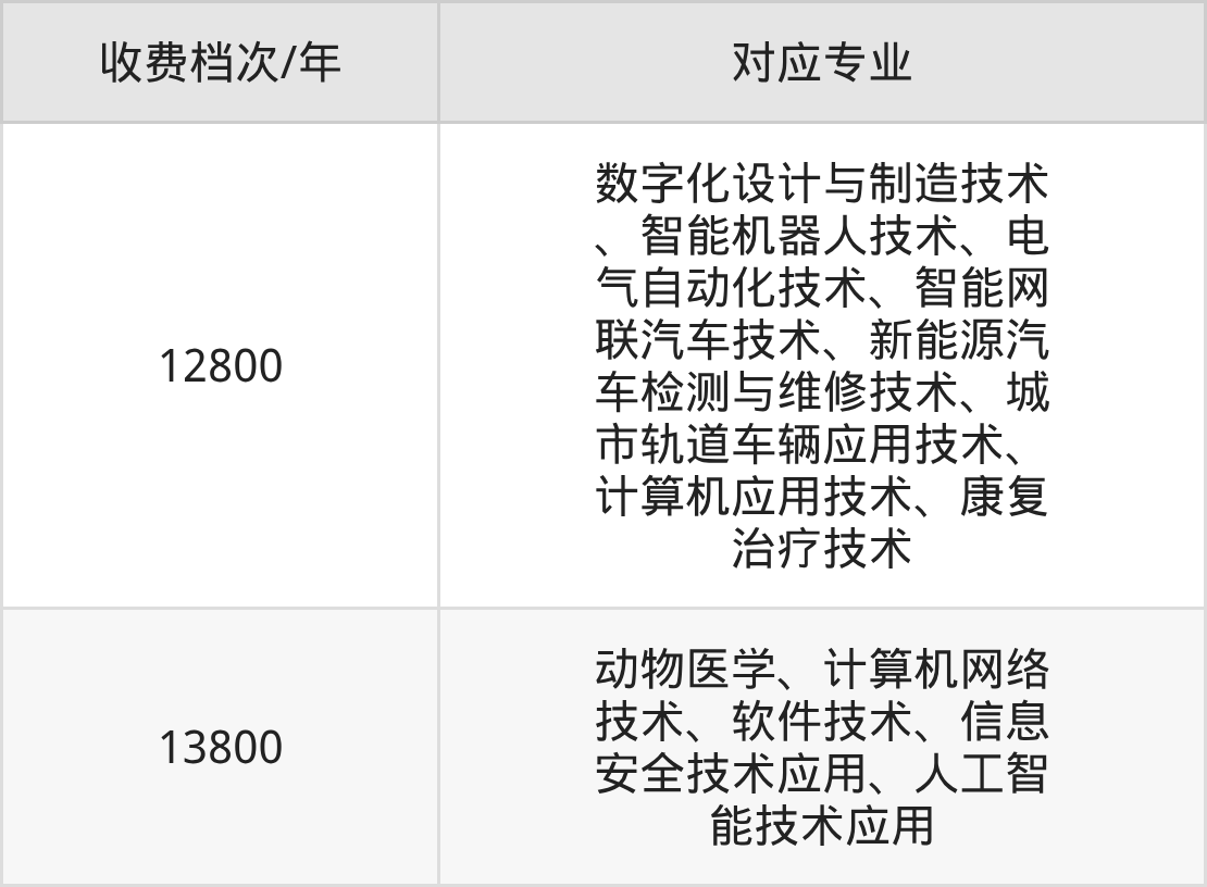 长春数字科技职业学院学费标准分为2档,最高收费为13800元/年、最低收费为12800元/年。学费标准主要受专业类型和学制影响,以下详细列举: