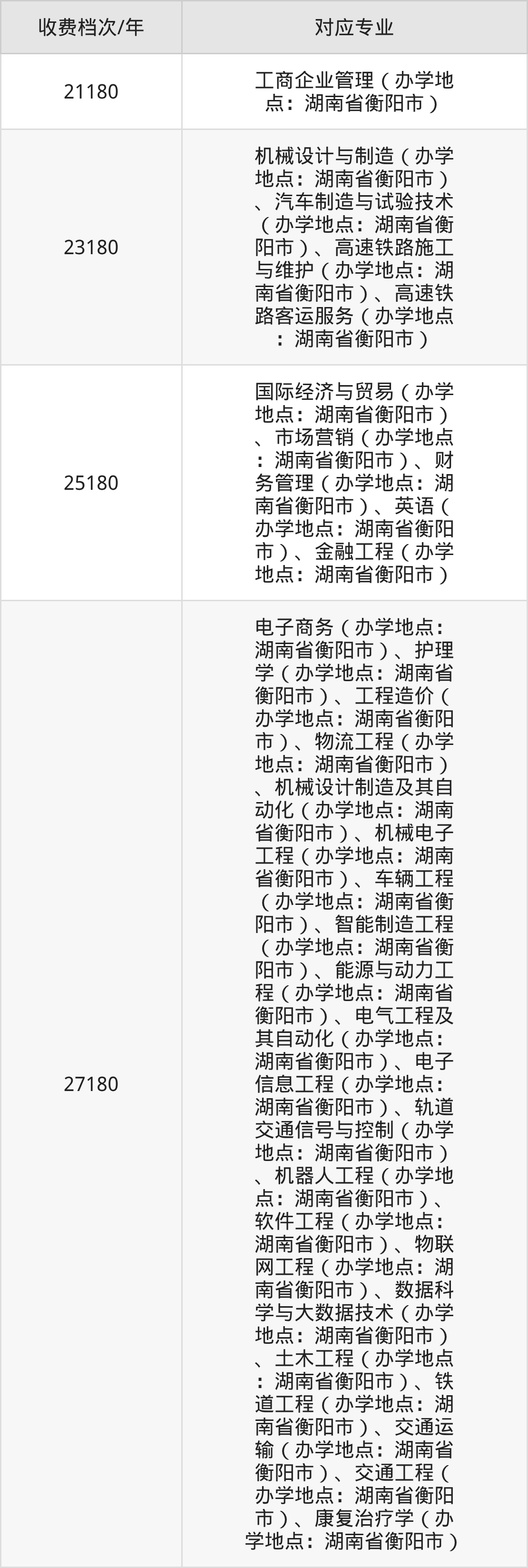 湖南交通工程学院学费收费标准第二档:23180元/年,该学费标准对应专业为机械设计与制造(办学地点:湖南省衡阳市)、汽车制造与试验技术(办学地点:湖南省衡阳市)、高速铁路施工与维护(办学地点:湖南省衡阳市)、高速铁路客运服务(办学地点:湖南省衡阳市),学制为3年。