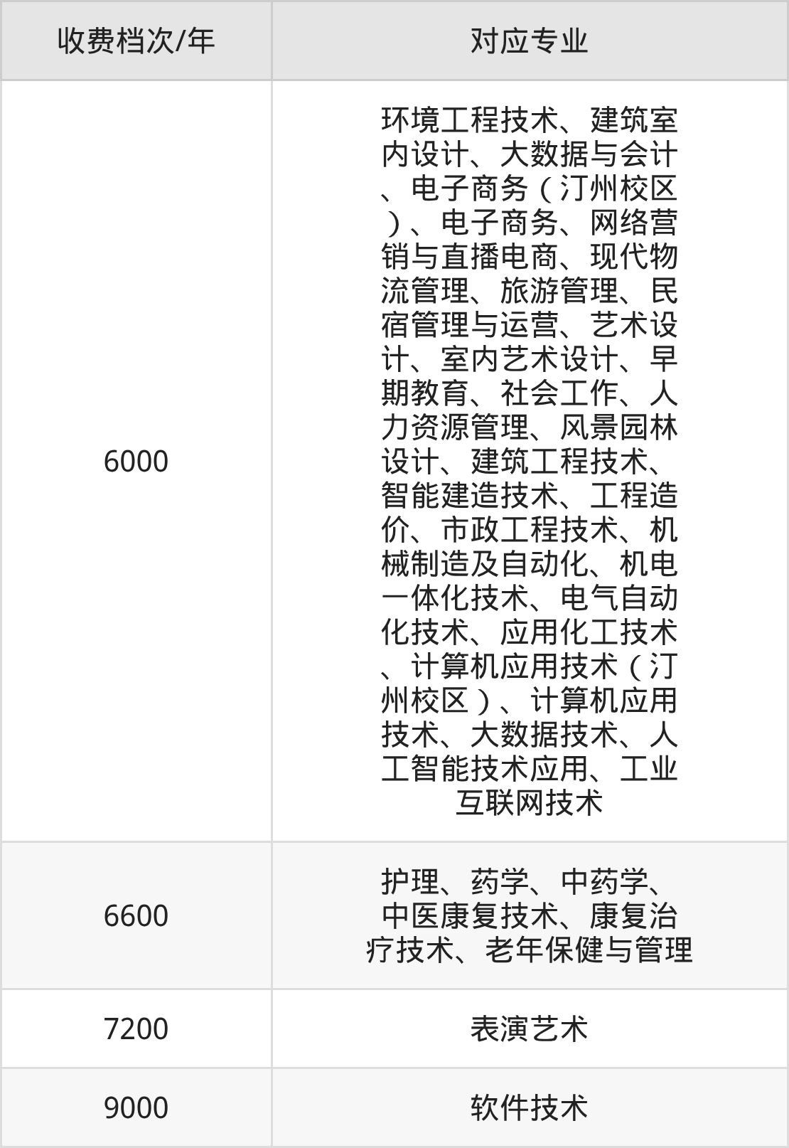 闽西职业技术学院学费标准分为4档,最高收费为9000元/年、最低收费为6000元/年。学费标准主要受专业类型和学制影响,以下详细列举: