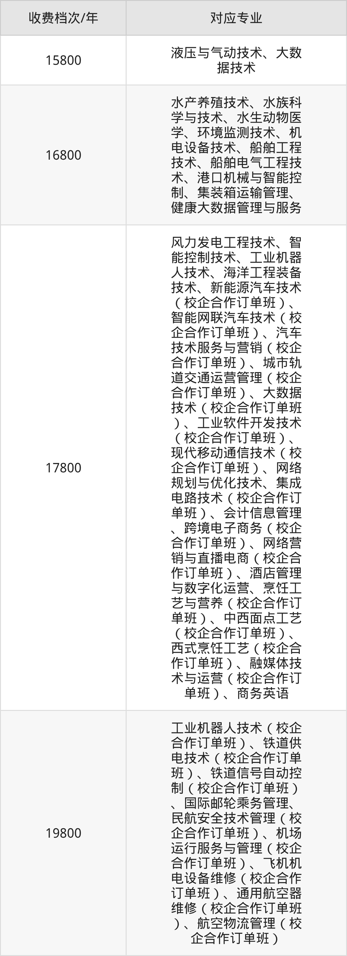 唐山海运职业学院学费收费标准第一档:15800元/年,该学费标准对应专业为液压与气动技术、大数据技术,学制为3年。