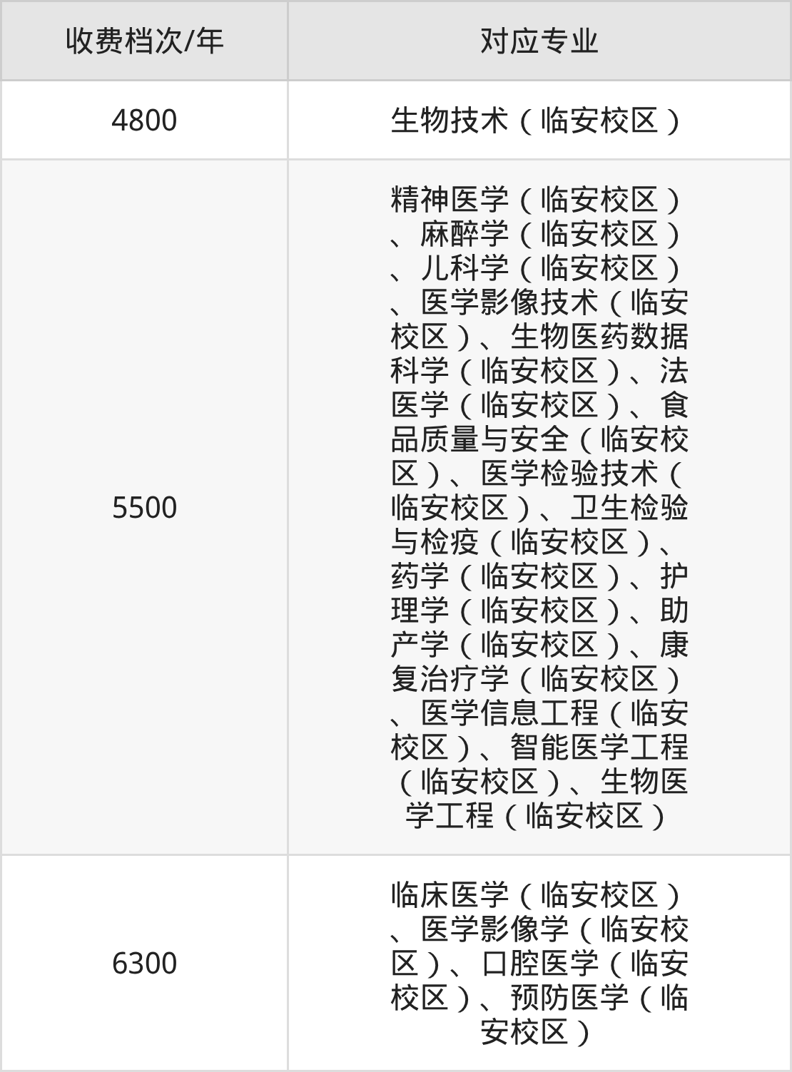 杭州医学院学费收费标准第一档:4800元/年,该学费标准对应专业为生物技术(临安校区),学制为4年。