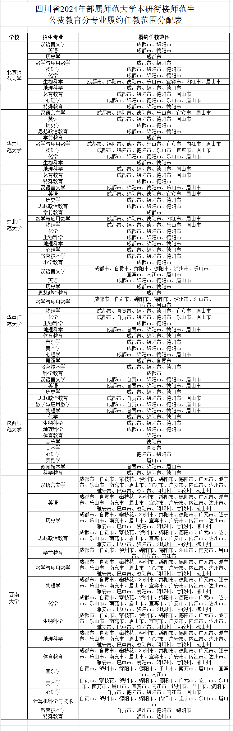 除了以上地方公费定向培养院校外,教育部直属师范院校(北京师范大学、东北师范大学、华东师范大学、华中师范大学、陕西师范大学、西南大学)也会在四川招收一批本研衔接公费师范生,这部分公费师范生就需要定向就业,多以也算在定向公费师范生的范围内。