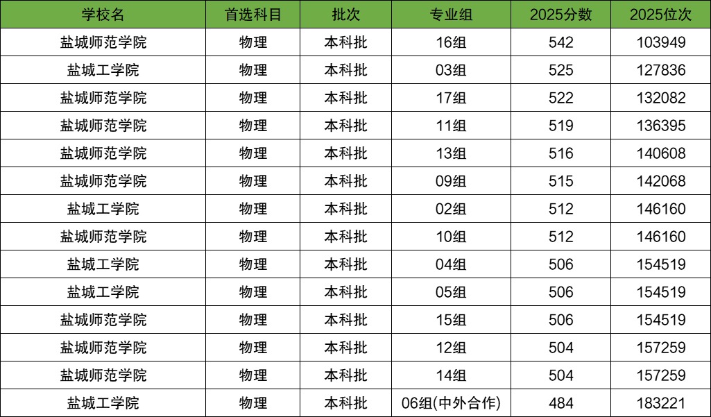 2025年盐城本科各大学中,在物理类分数线最低、最好考的院校是盐城工学院(06组、中外合作),2025年录取分数484分,最低录取位次183221位。