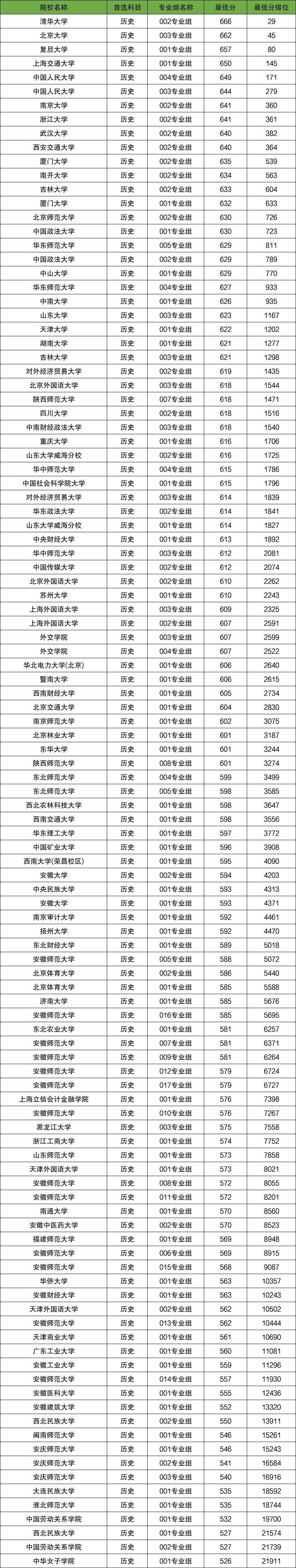 2025年安徽省国家专项计划历史类最高为666分,录取院校专业组为清华大学002专业组;最低为526分,录取院校专业组为中华女子学院001专业组。