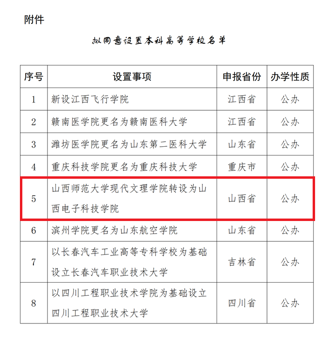 今年11月,教育部同意山西师范大学现代文理学院转设为公立本科大学。山西师范大学现代文理学院诞生于本世纪初,迄今已有21年的本科办学历史。目前全国仅有4所以电子科技命名的公办本科高校,所以,学校改名为山西电子科技学院也将吸引大批考生报考。