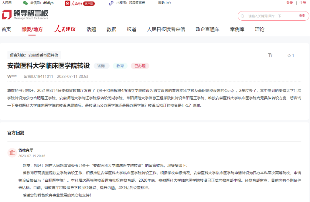 在今年7月,安徽省教育厅回复网友安徽医科大学临床医学院转设的最新回答,称学校已经向教育部正式申报了转设的事宜,但因为有些条件没有达标,所以现在暂未转设成功,目前学校正在积极加快转设,争取尽快达到转设的标准。