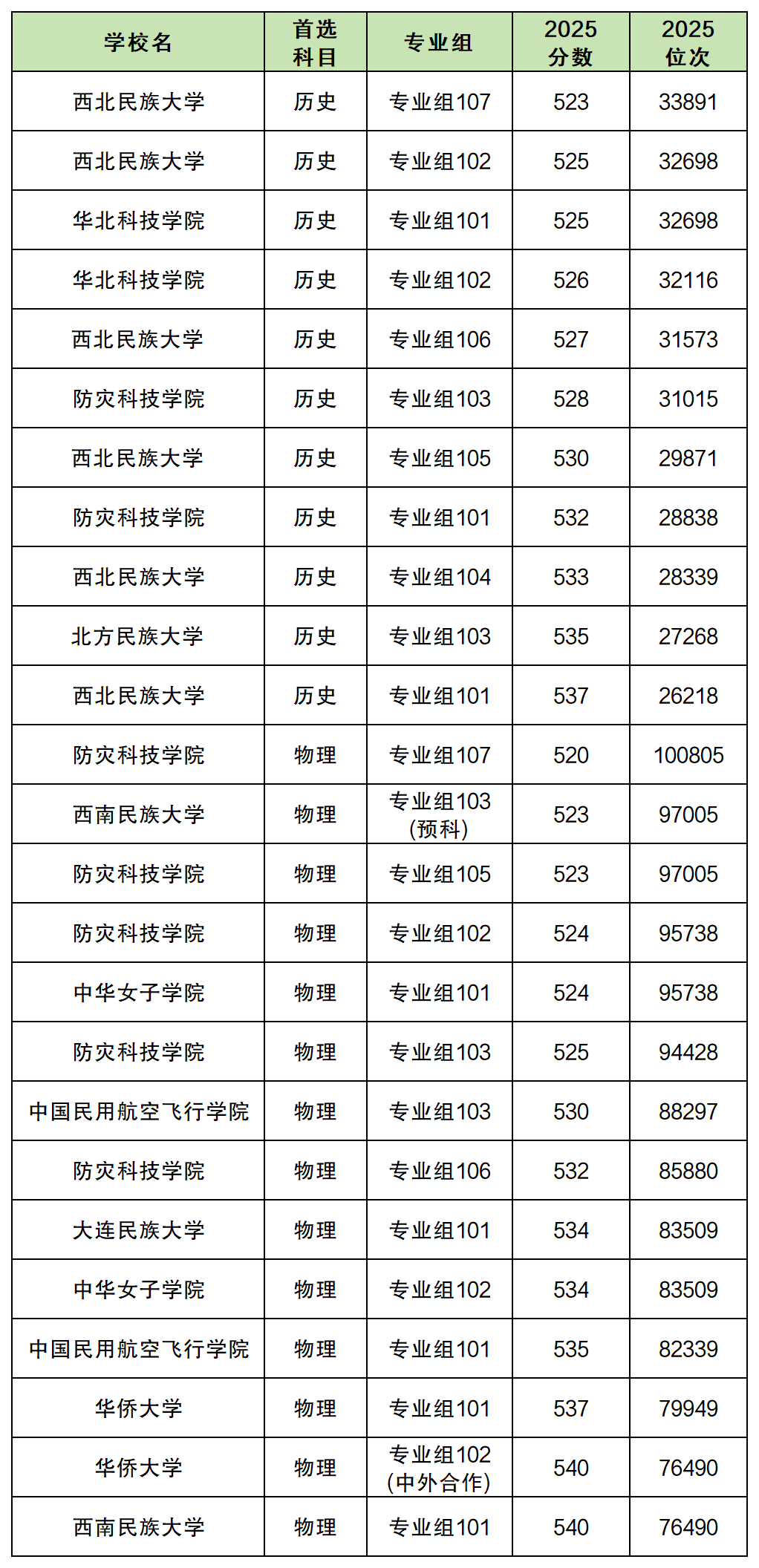 物理类分数线520分到540分的公办二本大学专业组有522个,如540分的西南民族大学101组、525分的防灾科技学院103组、523分的北京农学院101组等。